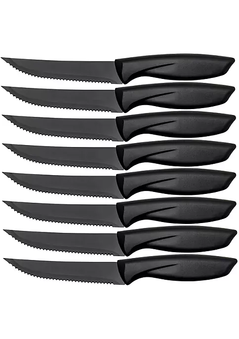 - Â 8-Piece Steak Knife Set consists of fully serrated and sharp knives made of stainless steel blades that cut effortlessly through meat. This set is the perfect gift for bridal showers and holiday gifts for women and men.