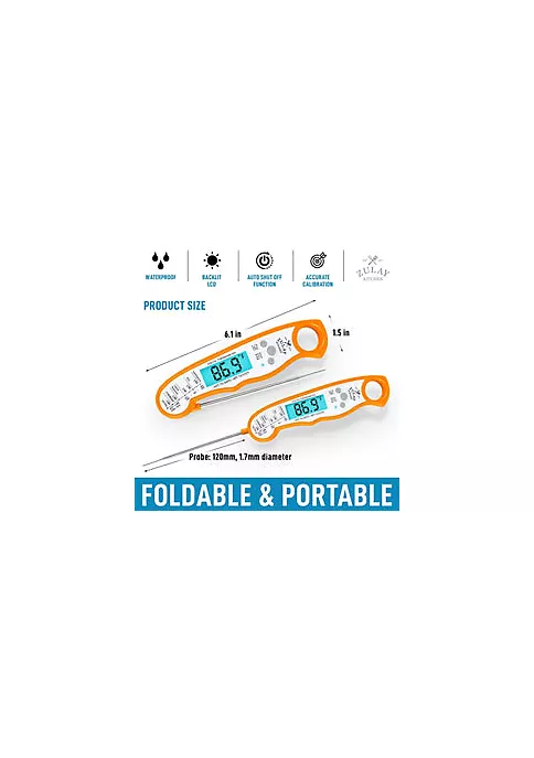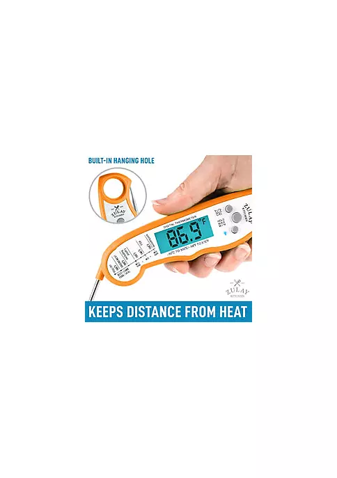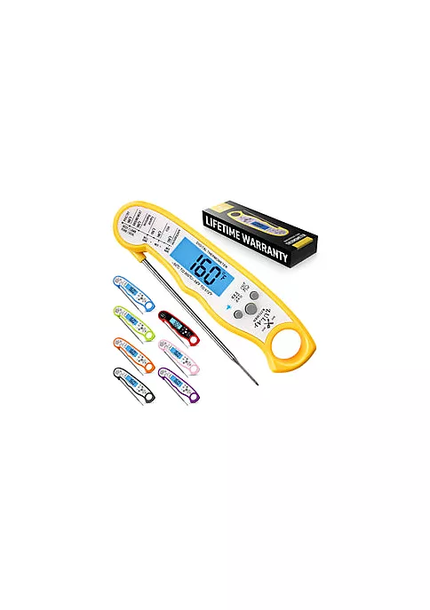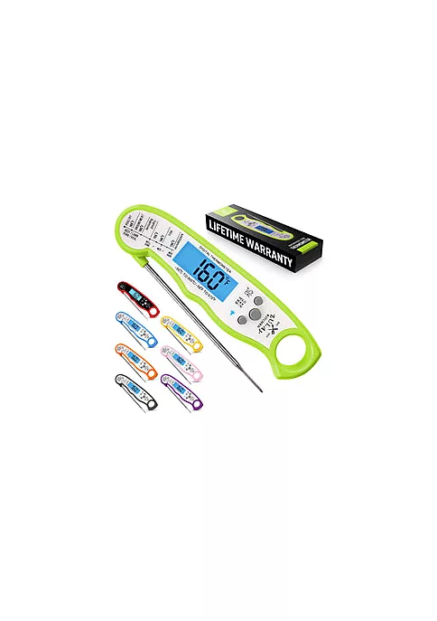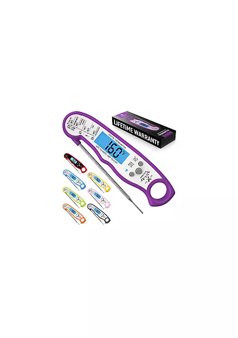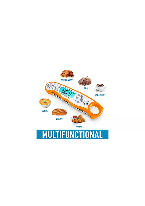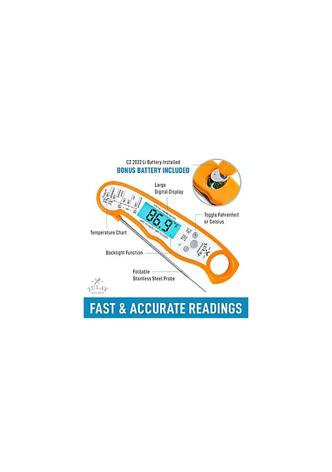 Ultra fast and accurate thermometer that instantly reads temperature within 3-4 seconds. Customizable configuration lets you switch from ºF or ºC. Accurate to ±1°F between -4ºF to 392ºF. Probe is 4.5″ long. After reading, fold the probe to turn off. Includes a power saver function that auto-offs after 10 mins of inactivity and turns back on when used.