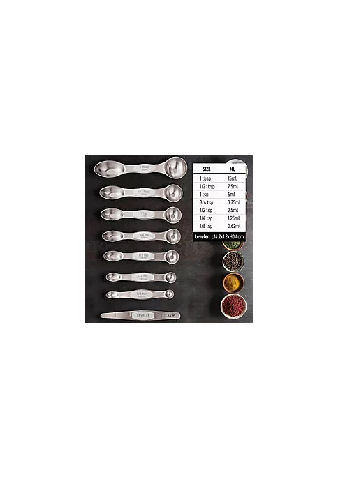 Precise Measurement For Cooking And Baking: Made from food-grade stainless steel with functional and compact construction featuring a set of 7 double-headed magnetic measuring spoons and 1 leveler. Labeled with easy-to-read US metric measurement marking that is non fading even after years of use.